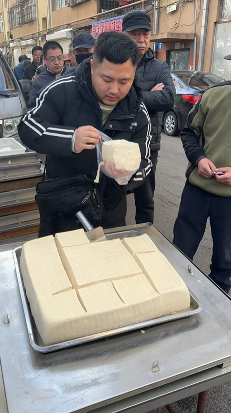 顧客們各有偏好,有人偏愛豆腐邊,緊實有嚼勁;有人就認準中間部分,細嫩滑口,專門買給家里的小孩吃。“要中間的。”“阿姨我不要邊,我要中間。”“給小孩愿意要這塊。” 金師傅總能精準滿足每個人的要求,小心翼翼地切下顧客想要的部分,動作輕柔,生怕碰壞了這嬌嫩的豆腐。“四個邊,16 的是吧?四個邊。中間給我撿。稍等,前面也要中間,著忙。”