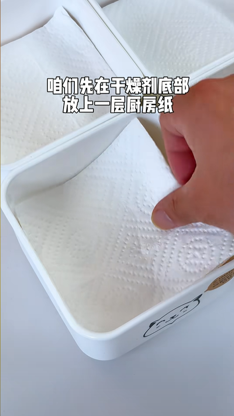 第一步,處理容器。我拿出四個大小合適的密封保鮮盒,在每個盒子底部均勻鋪上兩層厚實的廚房紙。這層紙非常關鍵,既能防止水果直接接觸干燥劑,避免可能的成分殘留,又能吸收水果滲出的多余汁水,保持盒子內部干爽,還能讓干燥劑的吸濕作用更均勻。