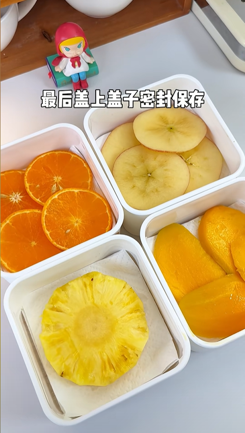 四種水果全部處理完畢,接下來就是最關鍵的一步 —— 密封。我在每盒水果上面再蓋一層廚房紙,然后緊緊蓋上密封盒蓋子,確保完全密封、不透氣。只有這樣,干燥劑才能持續吸收盒子里的水分,營造穩定的干燥環境,讓水果慢慢脫水。如果密封不嚴,外界濕氣不斷進入,實驗就很容易失敗。
