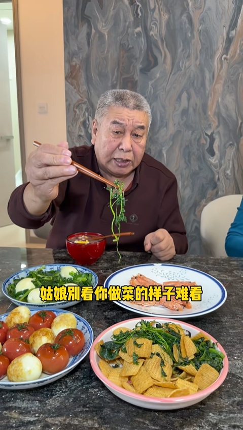 剛上桌時,菜品賣相還算過得去,色澤搭配均勻,讓人眼前一亮。可仔細端詳,就發現不少小瑕疵,賣相實在算不上精致。家人忍不住調侃:“這菜乍一看還挺好,仔細一看還不如乍一看。” 老韓頭不服氣,拍著胸脯自稱 “廚師界的天花板”,結果立馬被家人拆臺,妥妥的廚房反面教材。姑姑更是直言不諱:“別看你做菜的樣子難看,入口味道也真難吃。” 逗得全家人哈哈大笑,餐桌上的氣氛瞬間活躍起來。