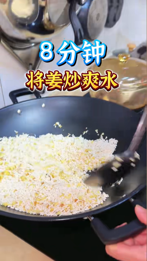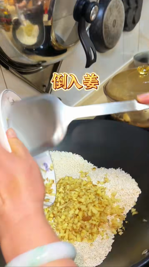 姜先拍一拍再切細粒,拍過的姜更容易出味,顆粒越小,香氣釋放越充分。全程不用放油,鐵鍋保持無水無油,這是炒成功的關鍵。
