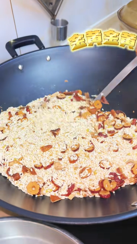 - 保持小火不停翻炒,直到所有食材都變成金黃色,干爽不黏,滿屋都是溫暖的姜米香,就可以關火了。