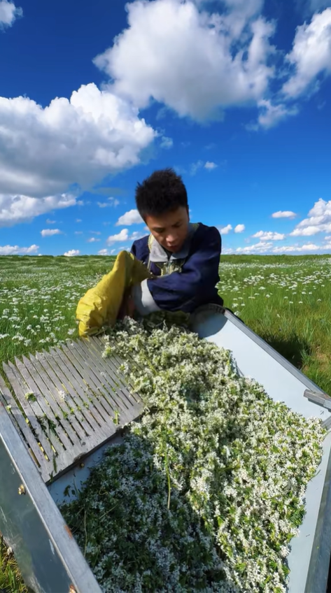 草原的遼闊總能讓人忘卻煩惱,鄰居家的院子大得望不到邊,足足一萬五千畝,走在其中,仿佛置身于無邊的綠色海洋。野生韭菜花就藏在草叢深處,它們不似家養韭菜那般規整,卻帶著十足的野性,細長的花莖挺拔有力,頂端簇擁著小巧的花苞,有的微微綻開,露出嫩白的花瓣,有的還是緊實的花骨朵,散發著淡淡的辛香,這是獨屬于草原的清新味道。我彎腰穿梭在花叢間,指尖輕輕掐下鮮嫩的韭花,不敢用力過猛,生怕損傷了根莖,影響來年的生長。不一會兒,竹籃里就堆滿了翠綠帶白的韭菜花,沉甸甸的,滿是自然的饋贈。