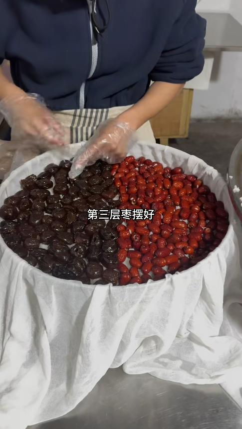 - 鋪好第三層棗后,再放第四層米封頂,然后上鍋蒸 20 分鐘,蒸好后壓一晚上,第二天就能拿去賣了。