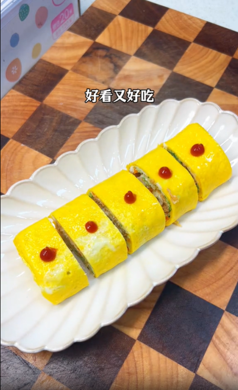 - 煎制厚蛋燒:玉子燒鍋(或平底鍋)開小火預熱,用刷子在鍋底刷一層薄油;倒入全部蛋清混合物,用鏟子輕輕攤平,讓食材均勻分布;待蛋液快要完全凝固(表面還有少許濕潤)時,用鏟子從一端緊緊卷起來,卷成圓柱形;卷好后繼續在鍋中煎 1-2 分鐘,讓表面定型,取出后切成 1.5cm 厚的小塊即可。