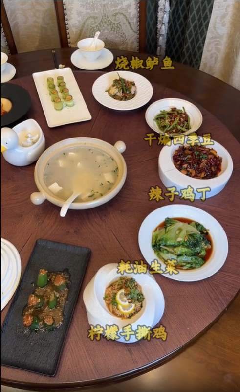 接 來 廚房時 ,成 米姐 秀場。她 腳麻利, 條鱸魚被她分成 份,魚骨用來 香酥魚排,魚肉 部分復刻 提過 燒焦鱸魚,另 部分 鮮 魚湯。3 塊錢 豬肉剁成肉末,和茄 搭配 成 寓意吉祥 “欣欣向榮”; 塊雞胸肉也 浪費, 半 成香辣雞丁, 半撕成絲 撕雞, 有烤南瓜、清炒時蔬、豆腐羹等菜品, 接連端 桌。