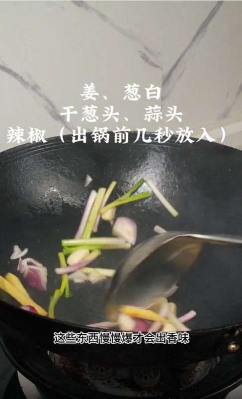 1. 同一口鍋不用洗,留少許底油,開中小火,放入拍開剁小的沙姜、切好的干蔥頭、蒜頭,以及蔥白段(蔥尾留著最后用),慢慢翻炒爆香,直到配料變色、沙姜香味完全釋放(中小火慢爆才夠香,大火容易炒糊)。