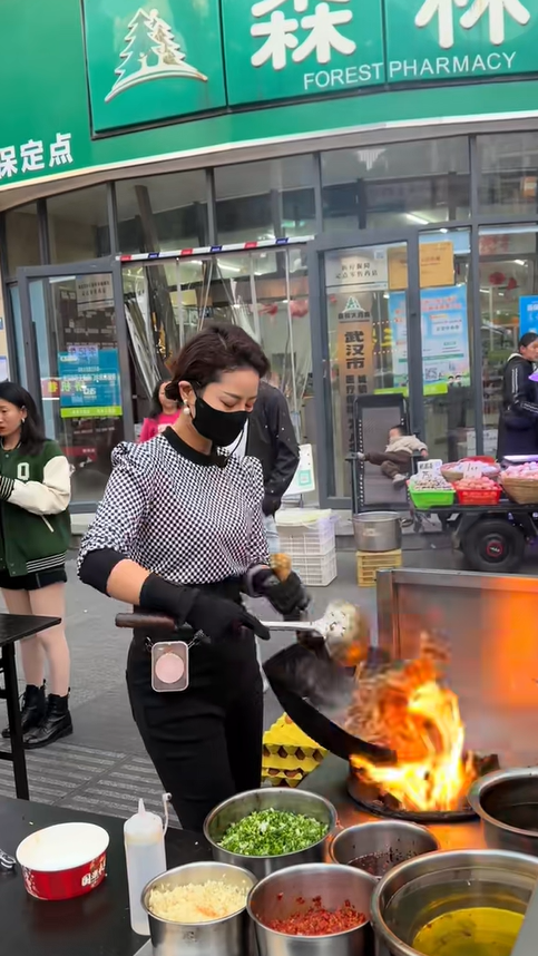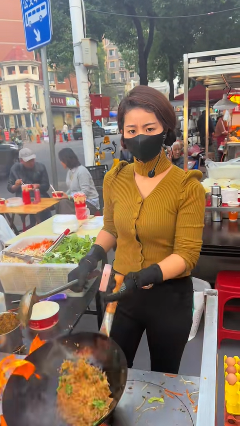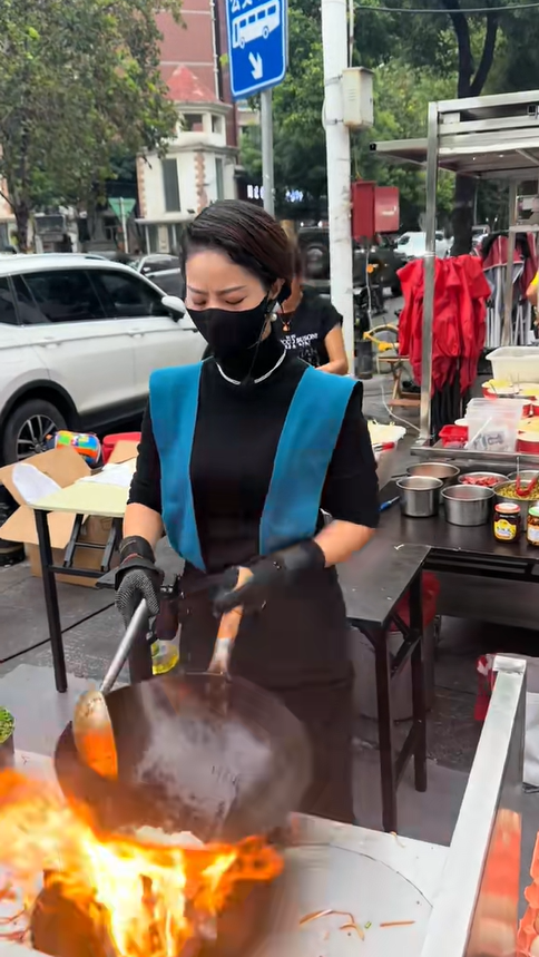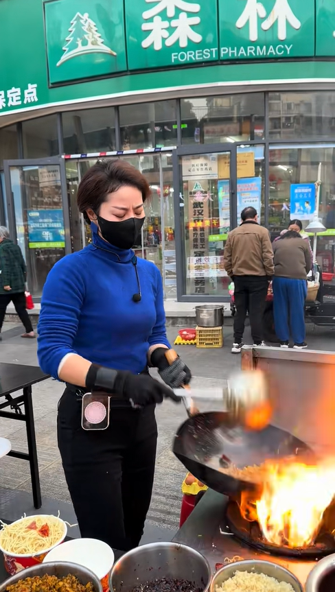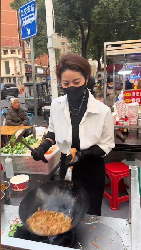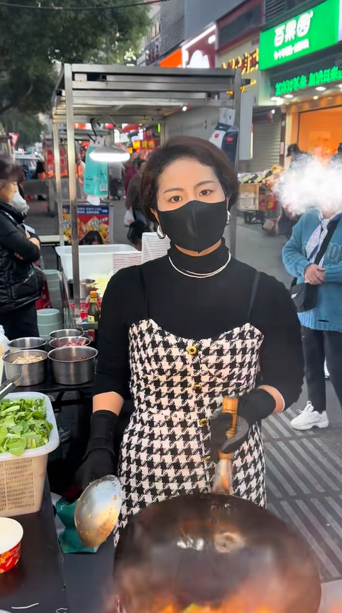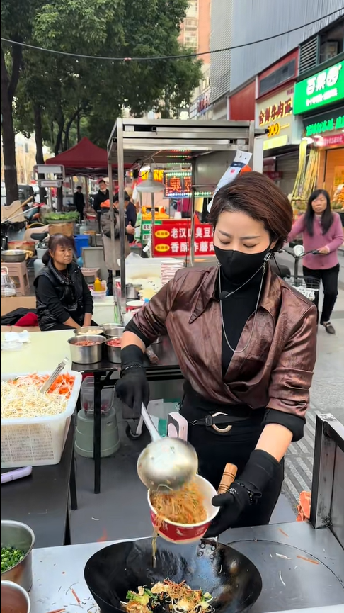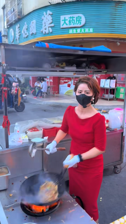 我的灶臺,就是我的 T 臺。支起鐵鍋,點燃爐火,倒入金黃的花生油,油熱后放入蒜末、小米辣爆香,香味瞬間飄滿整條街巷。我左手掂著鍋柄,右手握著鍋鏟,隨著音樂的節奏(我攤位上總放著舒緩的輕音樂),手腕用力一顛,米粉在空中劃出一道優美的弧線,再穩穩落回鍋中。這時,高跟鞋踩在地面上,跟著顛勺的節奏輕輕晃動,裙擺隨著動作微微揚起,口罩上方的眼睛彎成了月牙,路過的行人常常會拿出手機拍照,說我炒粉的樣子像在走秀。