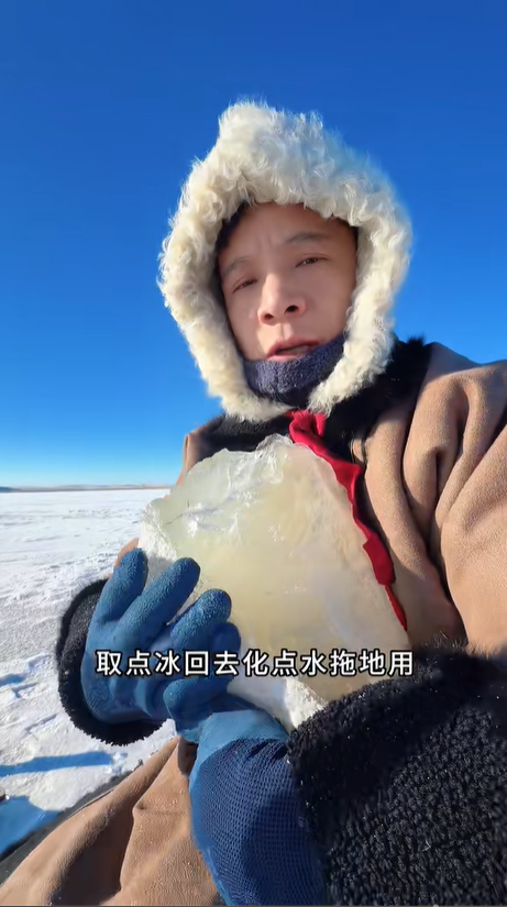 今天不太忙,去河邊取點冰再回家喂個羊,鄰居就過來找我了給他吃點不一樣的暖暖身子