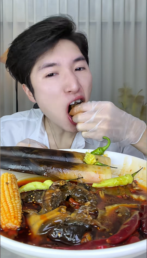 視頻一開場,他面帶微笑,語氣溫柔地一句 “hello baby” 瞬間拉近了與觀眾的距離。干凈利落的穿搭,從容不迫的姿態,很難讓人將這個斯斯文文的博主與 “無辣不歡” 聯系起來。但當麻辣甲魚、野山椒手剝筍、活珠子這些硬核美食悉數登場時,熟悉他的粉絲都知道,一場辣味狂歡即將開啟。