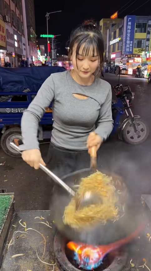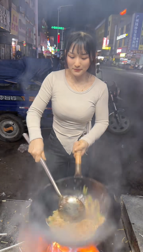 夜幕低垂,廣東東莞的城中村街頭亮起串串暖黃路燈,油煙混著米粉的香氣在晚風里彌漫。晴子的炒粉攤就支在巷口最熱鬧的拐角,鐵皮推車擦得锃亮,煤氣灶上的鐵鍋泛著油光,她系著洗得發白的圍裙,正手腕翻飛地顛著勺,火苗 “騰” 地竄起,映亮她帶著汗珠的臉頰。這個來自安徽農村的姑娘,已經在這片異鄉的煙火里,用一把鐵鍋、一把米粉,重復了一千多個日夜。