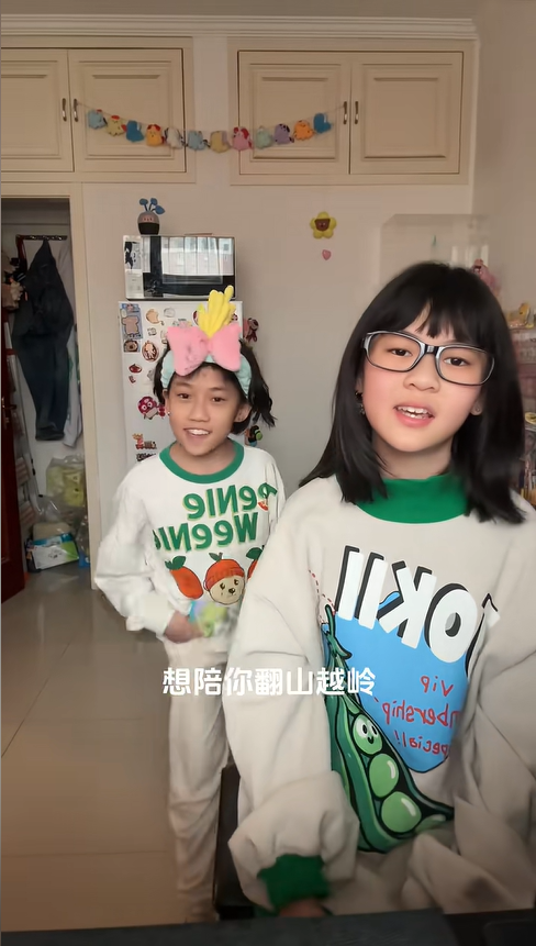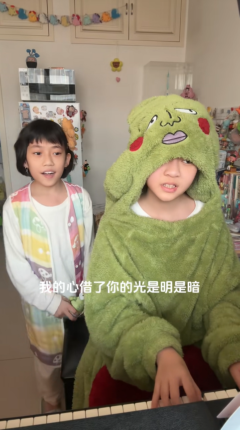 姐妹倆的練歌房,永遠是家里最熱鬧的地方。往往是姐姐先坐在鋼琴前,指尖輕抬,悠揚的前奏便緩緩流淌出來,妹妹則會蹦蹦跳跳地站在一旁,一開始總忍不住開啟 “搞笑模式”—— 唱到抒情的歌詞時故意擠眉弄眼,模仿搞怪的唱腔拖長調子,或是伴著旋律做些夸張的肢體動作,一會兒假裝忘詞對著鏡頭吐舌頭,一會兒又突然湊到姐姐身邊撓她的胳膊,惹得姐姐笑到指尖發顫,琴音也跟著拐了彎。可只要姐姐輕咳一聲,說一句 “認真唱咯”,妹妹便會立刻收斂起嬉鬧,腰背挺直,眼神瞬間變得專注。當她的歌聲響起,所有人都會被這份突如其來的驚艷打動:清亮的嗓音通透干凈,高低音轉換自如,氣息穩得讓人驚嘆,就連最難的轉音和高音,都能唱得絲滑流暢,與姐姐溫柔的鋼琴伴奏完美融合,琴音襯著歌聲,歌聲繞著琴音,勾勒出獨屬于她們的音樂美好。