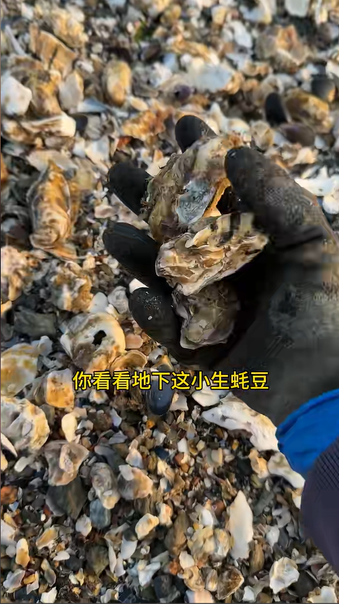 剛踏上灘涂時,目光掃過一片礁石灘,心里還微微犯嘀咕,看著光禿禿的礁石,竟沒瞧見多少生蠔的影子,扒拉了一圈也沒什么收獲,連妹妹都忍不住嘟囔,是不是來早了,生蠔都藏起來了。就在我們收拾工具,打算轉身離開時,賢姐眼尖,扒開一堆細碎的小貝殼,驚喜地喊出聲:“快來看,這有小生蠔崽!” 湊過去一瞧,瞬間喜出望外,礁石的縫隙里、貝殼堆下,全是圓滾滾的小生蠔豆,密密麻麻的,遍地都是,隨手一扒拉就能抓上兩個,個頭不算大,卻個個溜鼓溜鼓的,看著就透著一股肥嫩。