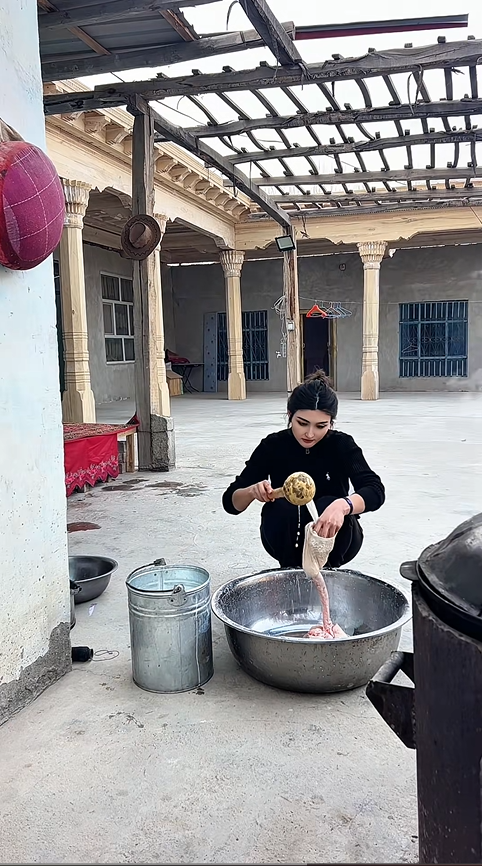 灌好的面肺子,通常會和新疆另一道特色美食米腸子同鍋慢煮,這也是新疆人吃面肺子的經典搭配。米腸子以羊腸為容器,灌入混合了羊肝、羊心、羊腸油丁的大米,加胡椒粉、孜然調味,煮制時要在米半熟時,用細釬子遍扎腸壁放氣,防止腸壁脹破。一口大鍋里,面肺子、米腸子、面筋一同在清水中慢煮兩小時,火候要始終保持微沸,讓面漿在肺中慢慢凝固,讓米腸的米香與肉香充分融合,煮好后的面肺子撈出來放涼,金黃中帶著乳白,捏起來軟嫩卻有彈性,米腸子則油潤飽滿,香氣撲鼻。