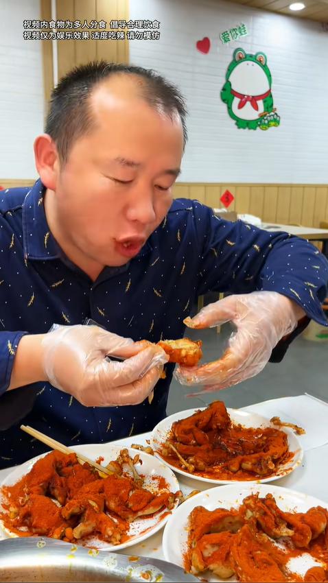劉金良沒有就此止步,又追加了幾只。他一邊吃一邊和食客互動,分享吃辣心得:“吃這種爆辣牛蛙,不能細品,要大口快速吃,搭配喝水緩解,越猶豫越覺得辣。” 有粉絲特意趕到現場,親眼見證他的挑戰過程,連連甘拜下風,直呼 “太厲害了,一般人一口就投降”。